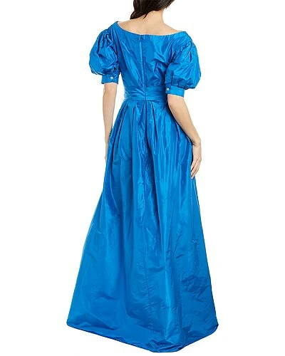- Off-The-Shoulder Silk Gown in blue with pleated puff sleeves, pleated skirt, and side seam pockets