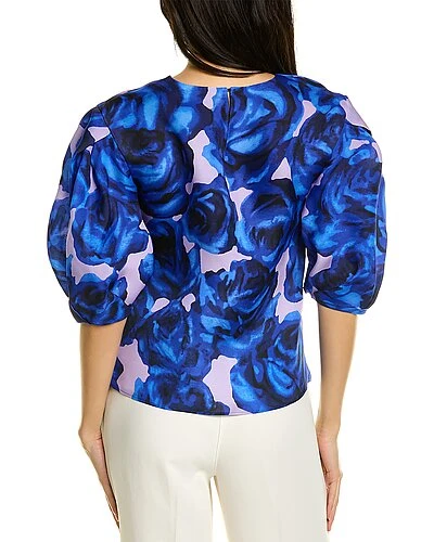 - Puff Sleeve Silk Top in lilac multicolor with pleated puff sleeves