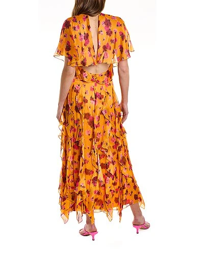 - Cascading Ruffle Maxi Dress in marigold multicolor with self-tie keyhole neck, flutter sleeves, and ruffle cascade skirt
